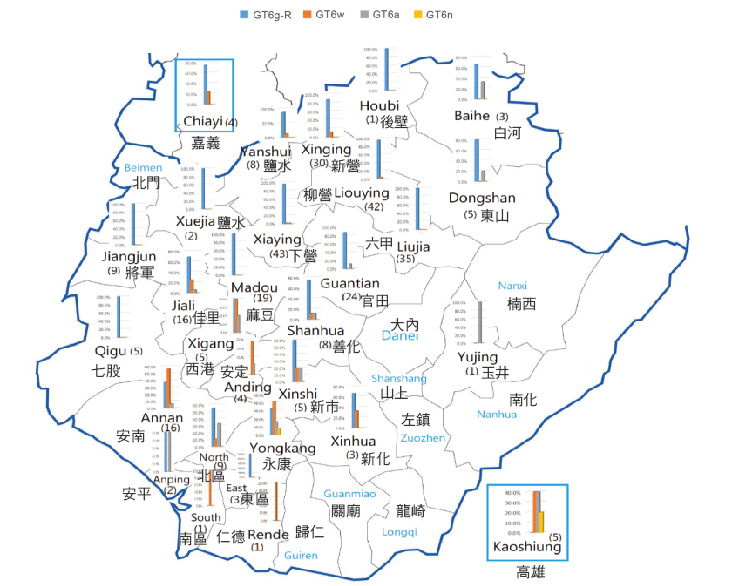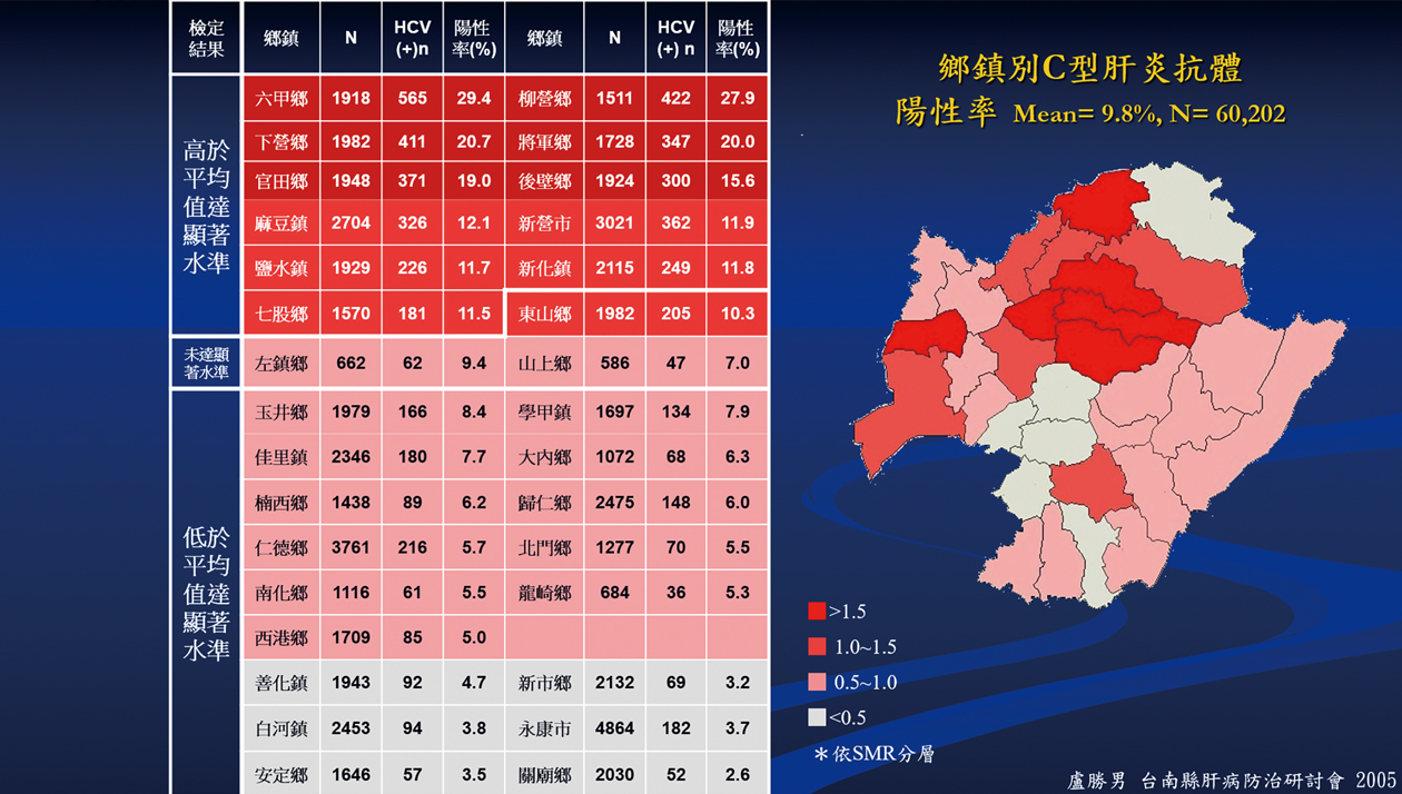 台南縣衛生局(縣市合併前)自2002年起配合成人健檢推行「行動醫院」篩檢,已經勾勒出台南地區的C肝盛行率地圖(如圖一)。