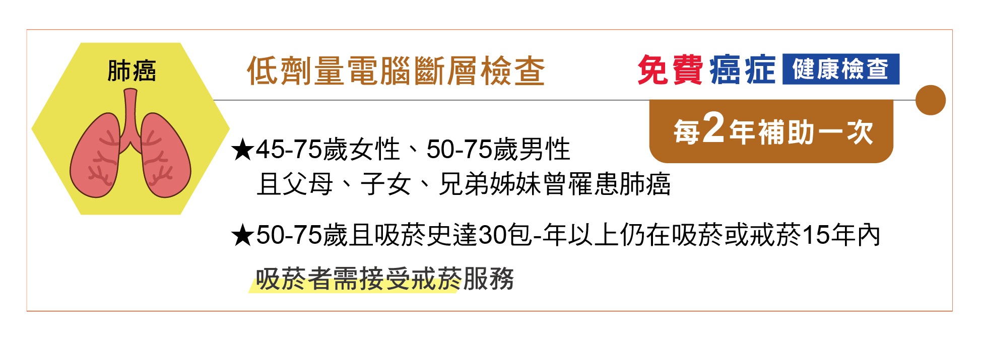 肺癌常見的症狀包括:咳嗽、咳血、胸痛或呼吸困難,民眾若出現相關症狀應及早就醫檢查。然而,早期肺部腫塊往往無明顯症狀,一般的抽血檢驗或腫瘤指數可能也無法提出警訊;胸腔X光檢查雖然有機會偵測出肺部異常,但對於癌前病變、微小肺部結節或躲藏在心臟或大血管後方的腫塊可能無法偵測出來。發表於2011年國際知名醫學期刊(新英格蘭醫學期刊)的文章指出:重度吸菸者每年進行低劑量電腦斷層掃描檢查(簡稱:LDCT),相較於接受胸腔X光檢查,可降低肺癌病人死亡率約20%。在一項台灣肺癌篩檢的研究中(TALENT study),使用LDCT針對胸腔X光檢查無異狀的民眾進行篩檢,發現肺癌的偵測率為 2.6%,其中約70%為第一期的肺癌疾病;該研究也指出:有家族病史的民眾有較高罹患肺癌的風險,其中尤以具一等親家族病史及年紀較大的民眾風險更高。國民健康署自民國111年7月開始針對高風險族群提供免費低劑量電腦斷層肺癌篩檢,高風險族群包括:具有肺癌家族史的50至 75歲男性或45至75歲女性,以及父母、子女或兄弟姊妹經診斷為肺癌的民眾或是年齡介於50至75歲、吸菸30包-年以上(包-年=每日吸菸包數x共吸菸幾年),有意願戒菸或已戒菸不超過15年的重度吸菸者。這些民眾可到國民健康署審核通過的肺癌篩檢醫院接受2年1次免費的LDCT篩檢。懷孕中的婦女、過去12個月曾接受過胸部電腦斷層檢查的或無法接受胸腔穿刺或手術的民眾不適合接受LDCT肺癌篩檢。