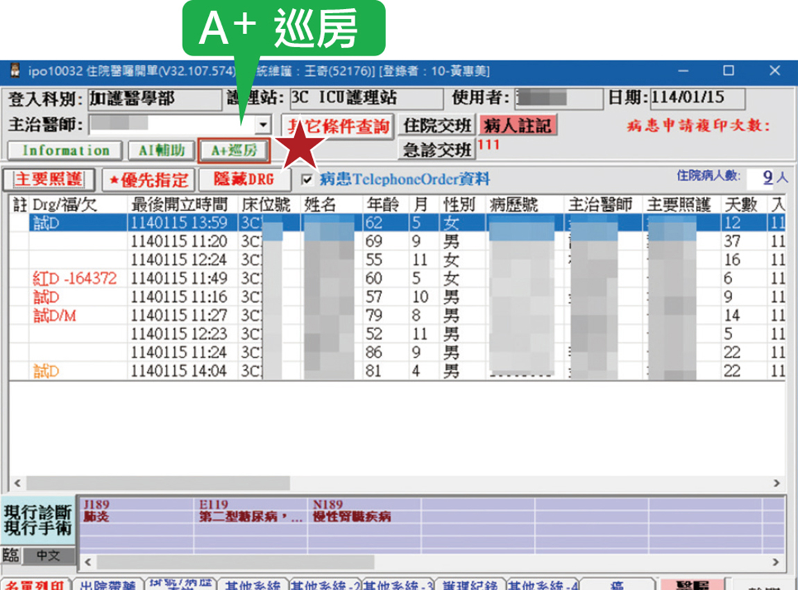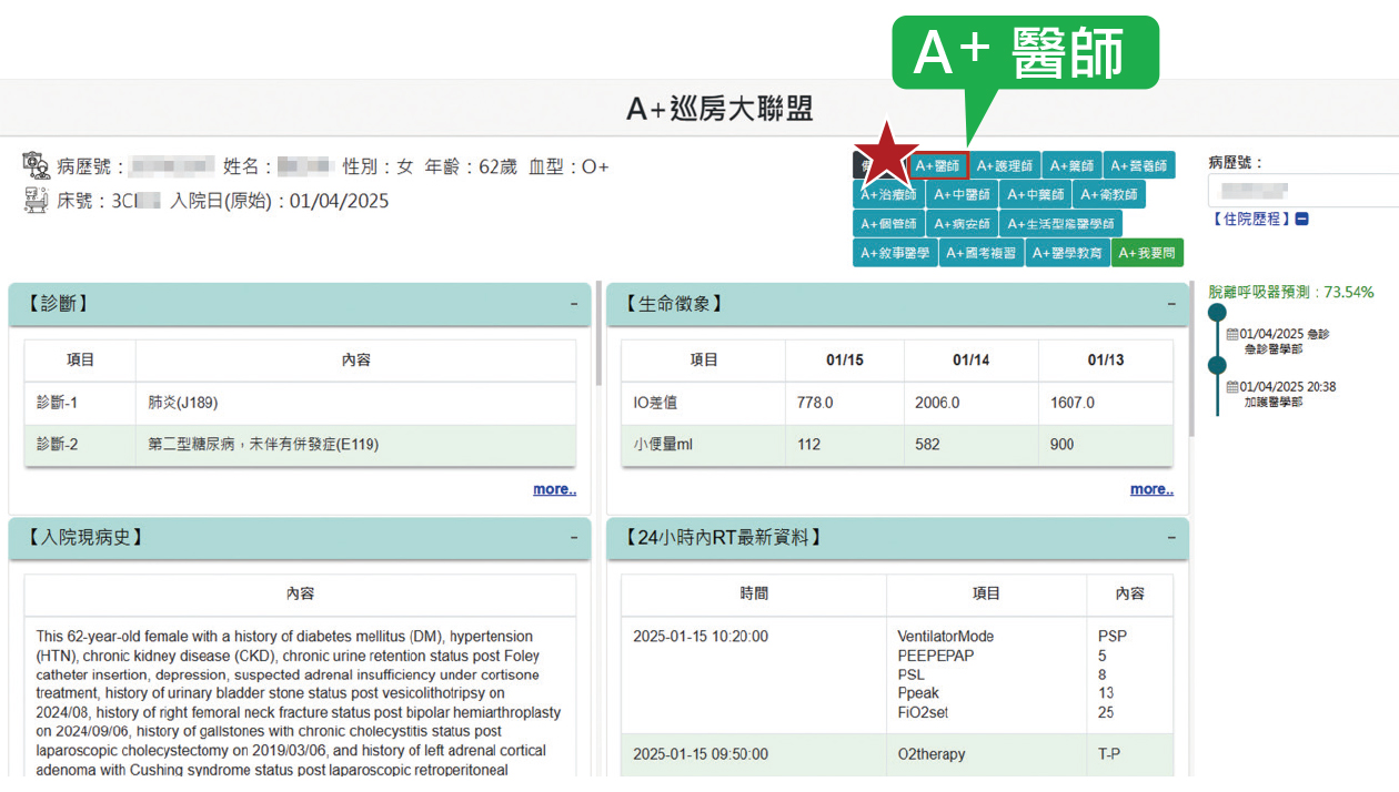 「A+巡房大聯盟」是一個集成多項功能的智能系統,專為醫療端的查房需求設計。它利用AI技術和資訊室的版面設計,將病人的各種信息整合在同一個畫面上,方便醫療人員快速獲取所需資料。這些信息,包括:病人診斷、入院現病史、現行醫囑(藥物)、24小時護理摘要、會診及團隊建議、生命徵象、氧氣療法及呼吸器設定、細菌培養和影像檢查...等。