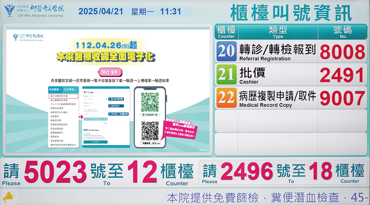 院大廳通常是人流最密集的區域,批價與領藥櫃台排隊人潮更是常見現象,對年長或體弱的病人與家屬來說,長時間站立等待是辛苦。為改善此狀況,讓等候的民眾不需排隊駐足,醫院於批價櫃台與領藥櫃台正在導入多媒體叫號系統,爾後民眾只需抽取號碼牌,便可在大廳的座位區安心等候,無需固定站在櫃台前排隊,待螢幕顯示號碼後再前往辦理批價或領藥,大幅減少站立排隊的困擾。