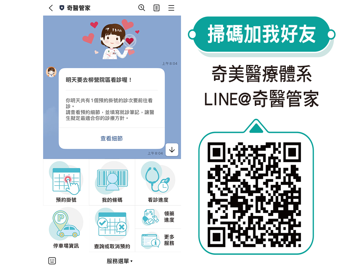 如果您也是LINE的愛用者,可以搜尋奇醫管家加入奇美醫療體系的服務,在家裡利用LINE預約掛號、查詢看診進度、領藥進度等等一應俱全的各式服務,可以讓您及您的親友更加方便的就醫。甚至可透過推播提醒民眾就診或檢查時程,確保醫療行程不遺漏,進一步提升民眾的就醫體驗。