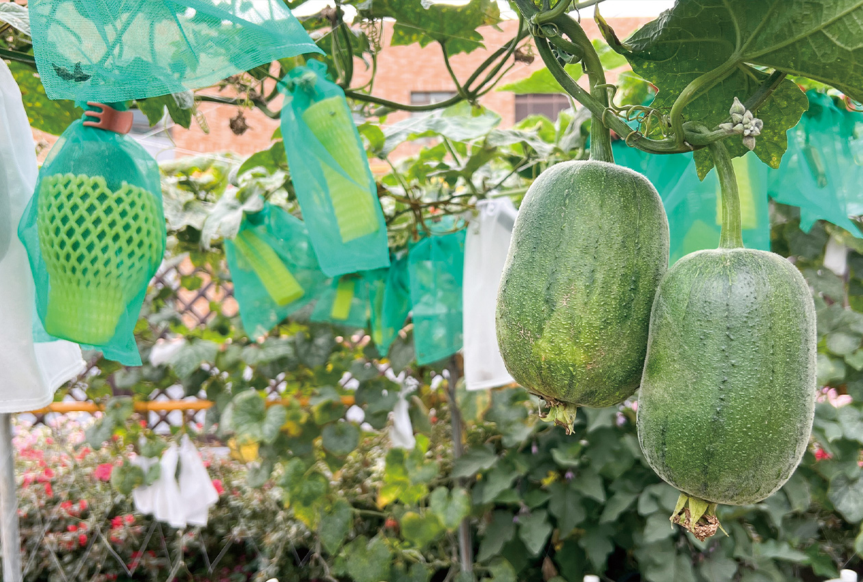「空中花園」獨有的二座蔬果棚架總與高聳外牆上的「奇美醫院」斗大字體相輝映。不同節氣種植的蔬果如:攀藤類蘋果絲瓜、番茄、南瓜、百香果,棚圍則有茄子、木瓜與些許芭樂,未及瓜熟蒂落,病友即奔相走告,傳奇式地蜂擁而至。殊不知鄉野的育種培植經驗交流,彷彿成為病友生活重心的一部分。