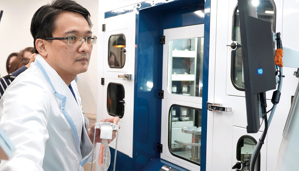 藥師林志遠現場示範「智能化療調配機器手臂」之操作