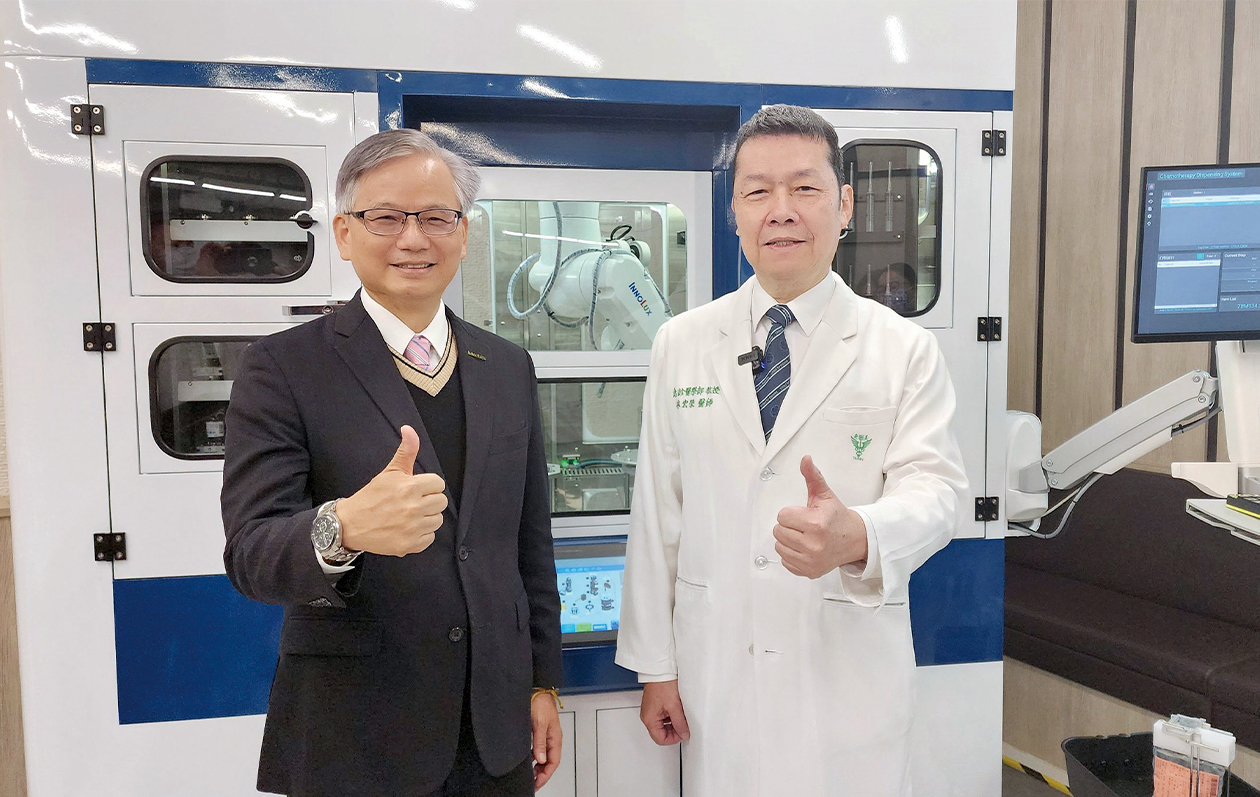 院長林宏榮和群創光電股份有限公司總經理暨營運長楊柱祥,與臺灣首台國產「智能化療調配機器手臂」