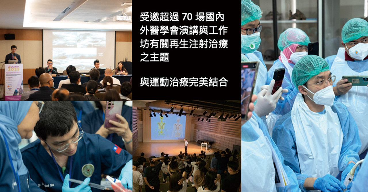 在奇美醫院復健部,再生治療團隊的醫師群在國際醫學會上擔任講師,並負責撰寫再生注射治療的國際教科書,自2015年開始已累計破萬例的再生治療(高濃度葡萄糖水與 PRP 等)成功案例。目前團隊醫師擔任台灣增生療法醫學會,台灣肌肉骨骼神經超音波醫學會,介入性疼痛超音波專家認證(CIPS)等之講師,每年並受邀至歐美及東南亞國家演講,定期指導國內及來自全世界各地之醫師相關技術。奇美醫院並於復健部引進德國最先進之旗艦型超音波,供再生醫療之臨床與研究處於國際領先之地位,自2024年至今,於再生注射治療方面與國外醫師一同發表17篇國際論文,包含兩篇第一作者,一篇通訊作者及一項國內專利。奇美復健部並將再生治療之訓練,落實到復健部住院醫師的訓練當中,讓團隊繼續茁壯。