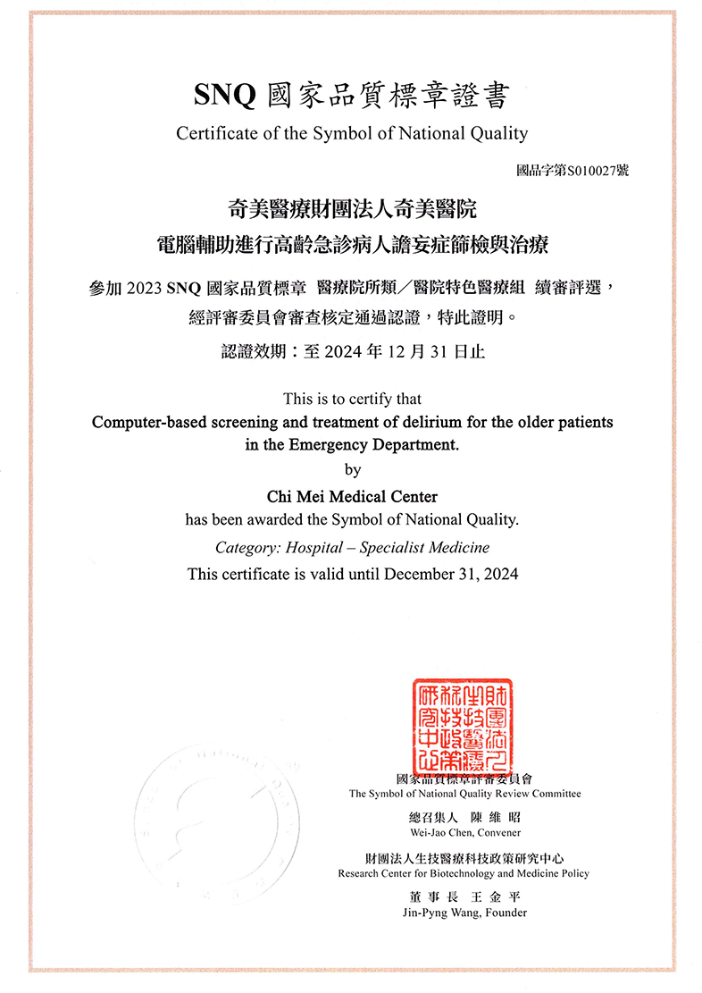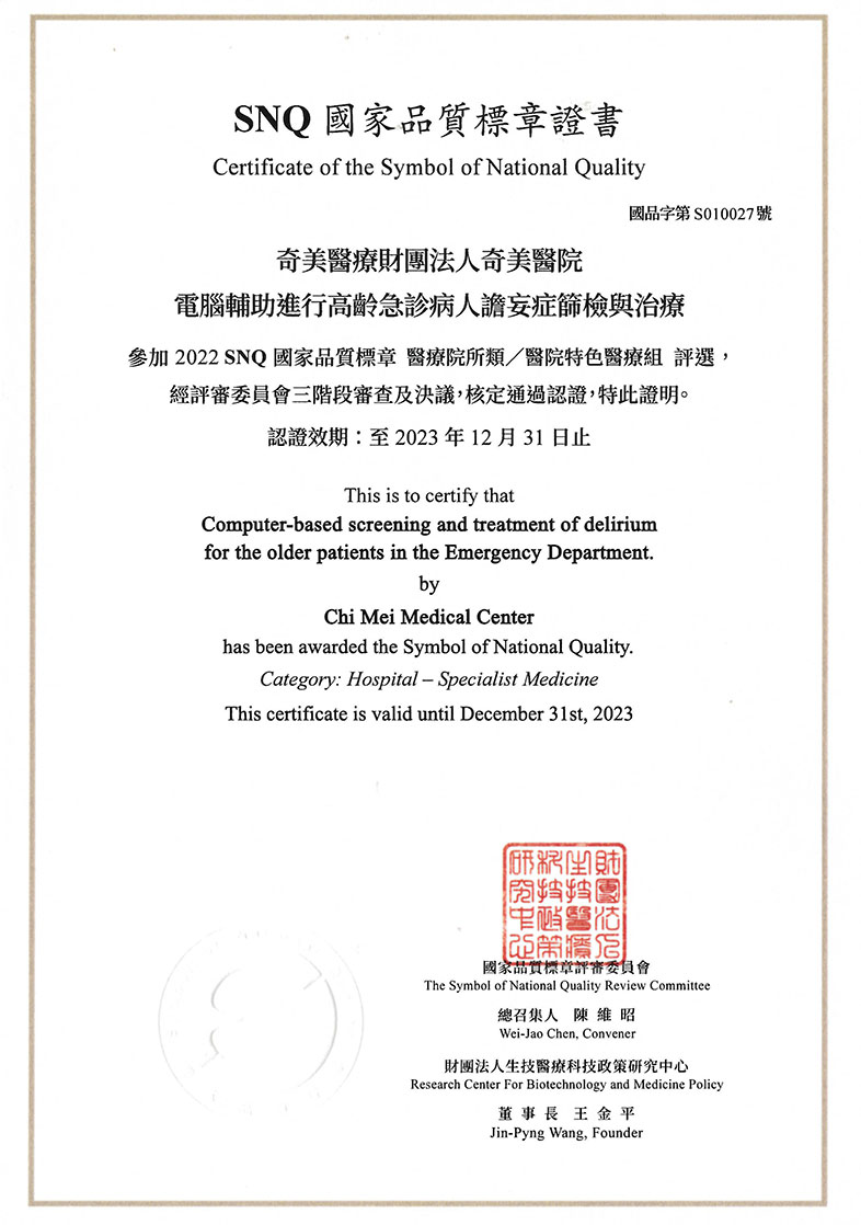 奇美醫院通過SNQ國家品質標章.國家生技醫療品質獎