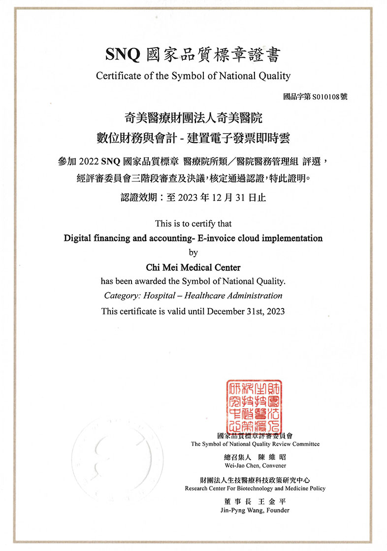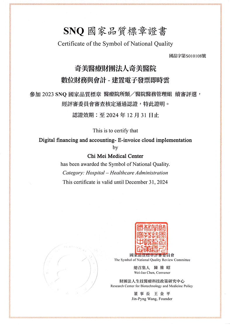 奇美醫院通過SNQ國家品質標章.國家生技醫療品質獎