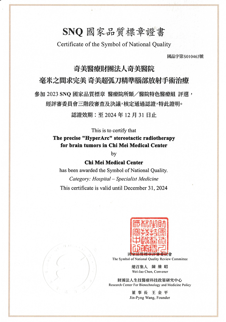 奇美醫學中心超弧刀,可執行最佳腦部立體定位放射手術治療,不僅誤差範圍小,治療前使用錐狀射束電腦斷層影像精準定位出腫瘤立體位置,治療中再輔以二維式影像確保誤差,並搭配目前最精密的多葉式準直儀(2.5mm)執行立體定位放射手術,在劑量分布上,無論是多發性病灶或形狀不規則腫瘤,其劑量分布緊密,能更貼合腫瘤的大小,形狀與位置,非共平面的治療角度可讓病灶外劑量快速降低,大幅降低副作用之發生率。另外,超弧刀可同時治療多個病灶。治療流程也大幅簡化,即使是多發性腦轉移也能在15分內完成治療,大幅減少近75%的治療時間,如此可有效減少治療中移動的誤差並提升病患舒適度,提升臨床效益。本團隊整合多專科,提供病人完善之治療計畫。