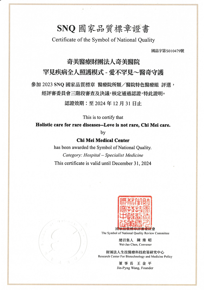 奇美醫院於2013年成立遺傳諮詢中心並通過國民健康署認證,為加強罕見疾病照護,遂於2022年更名為遺傳暨罕見疾病中心。本中心建立跨科部及跨院「遺傳及罕見疾病服務網絡」,服務包括:(1)提供遺傳諮詢、檢驗轉診,協助追蹤及預防。(2)提供國內外遺傳診斷、治療之轉診及轉檢聯繫。(3)推動遺傳罕見疾病診斷、諮詢及診療發展與研究,及(4)推動遺傳及罕見疾病相關社會教育。並自106年12月起承接國民健康署罕見疾病照護服務計畫,依罕見疾病整合式資訊系統分派,逐年累計共2387案;奇美醫療體系同時具有醫學中心(永康奇美醫院)、區域醫院(柳營奇美醫院)及地區醫院(佳里奇美醫院),有良好的垂直整合並有居家醫療及長照系統之網絡;且與雲嘉南地區各層級醫療院所有良好合作關係。因此雖然本計畫服務對象多為其他醫院通報個案,且個案居住地不只是台南還包含雲林、嘉義地區,執行上相對困難,藉由跨科部組成「罕見疾病照護服務」執行團隊及以核心工作小組為聯絡窗口,整合醫療、長照、社福等各方面資源,讓罕見疾病病人及家庭能得到全方位的照護服務。此「罕見疾病全人照護模式」於2023年有幸榮獲SNQ國家品質標章。