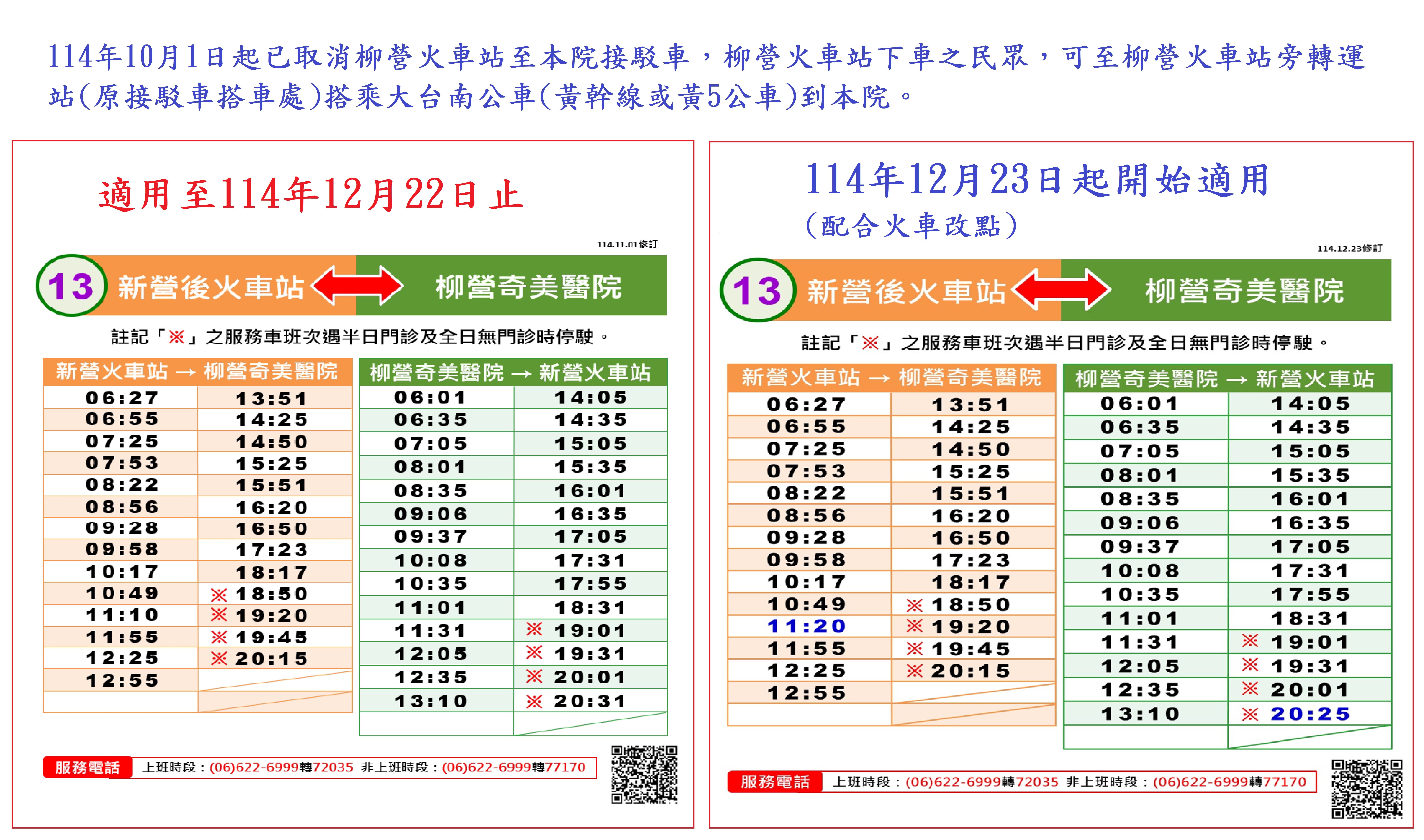 新營後火車站往返柳營奇美醫院(接駁車時刻)